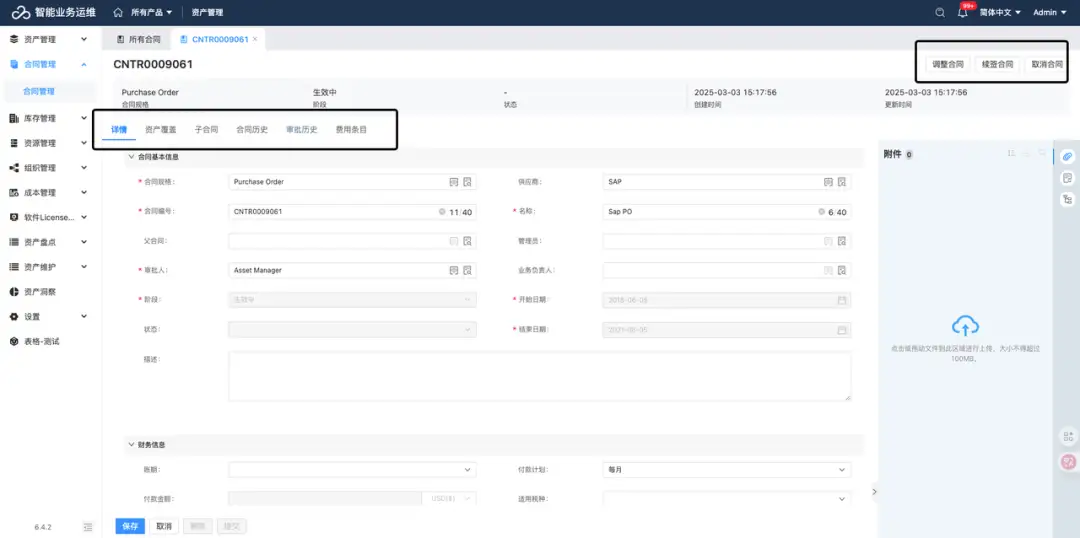 合同管理:支持九大合同类型的统一管理,同时可将合同、资产、供应商进行关联,作为后续数据查询分析的依据。