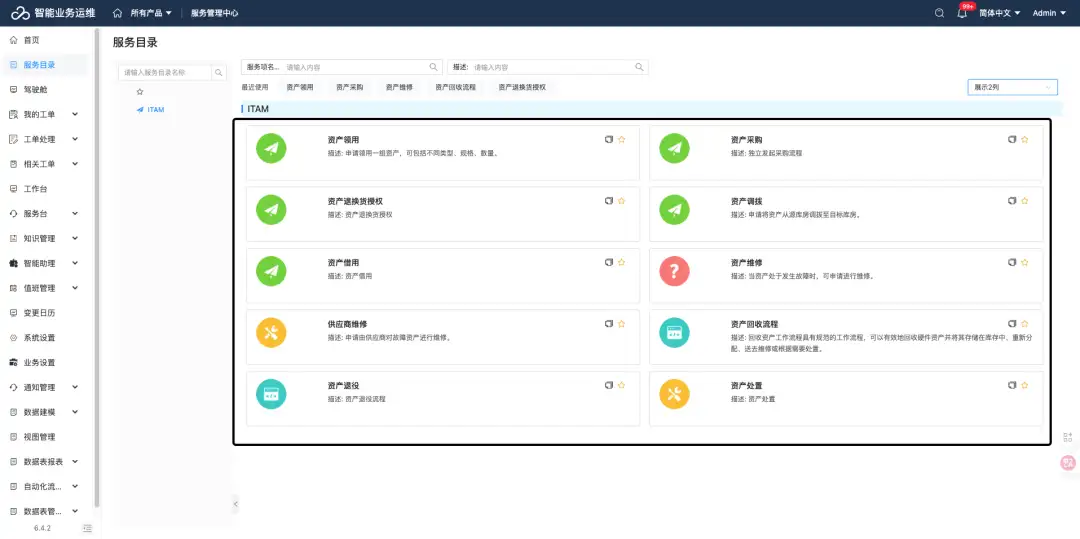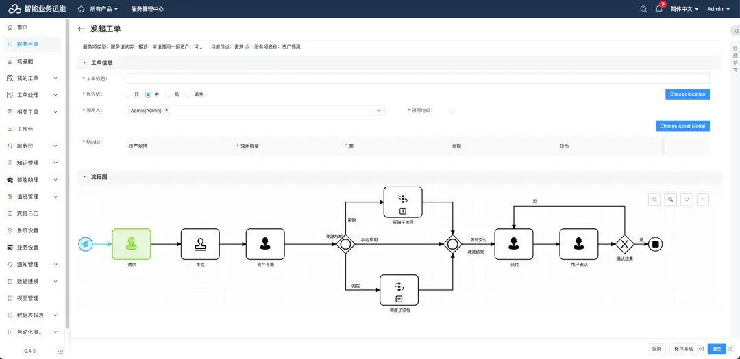 自定义流程工单:支持复杂流程的自定义配置,为资产的日常领用、采购、到货、部署、维护、退役、处置等场景提供支撑。