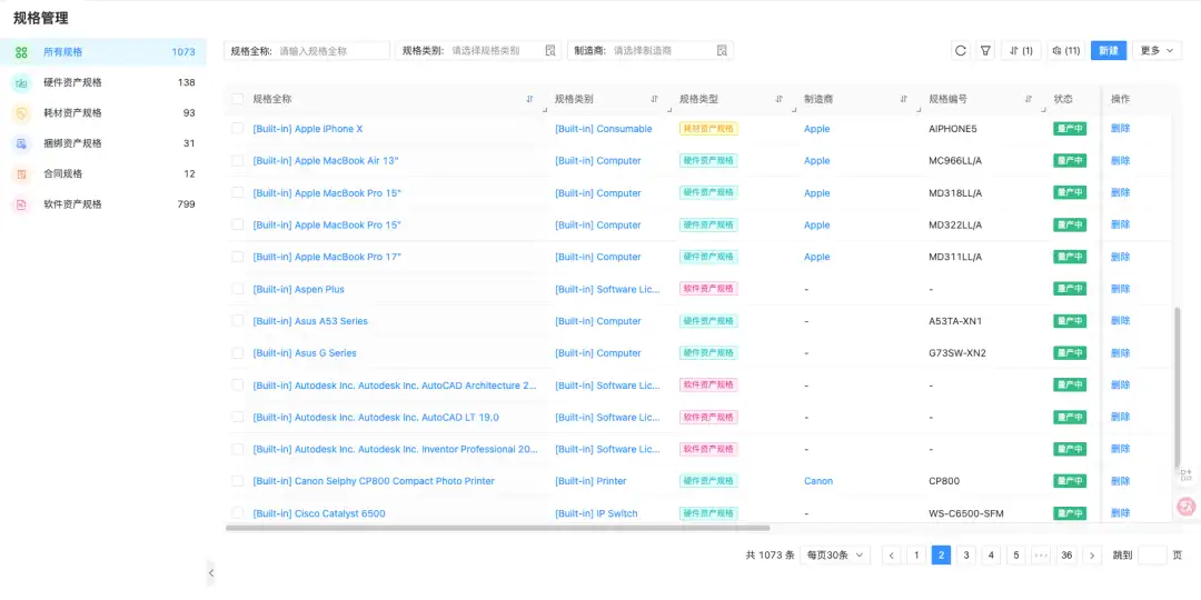 可见性是所有治理的基础,轻帆云IT资产管理构建了一幅企业IT环境的“活地图”。其核心资产台账支持对硬件、软件、耗材、合同、托盘、捆绑资产等规格进行管理,基于预设的规格模板可快速录入资产信息,形成资产全景视图。