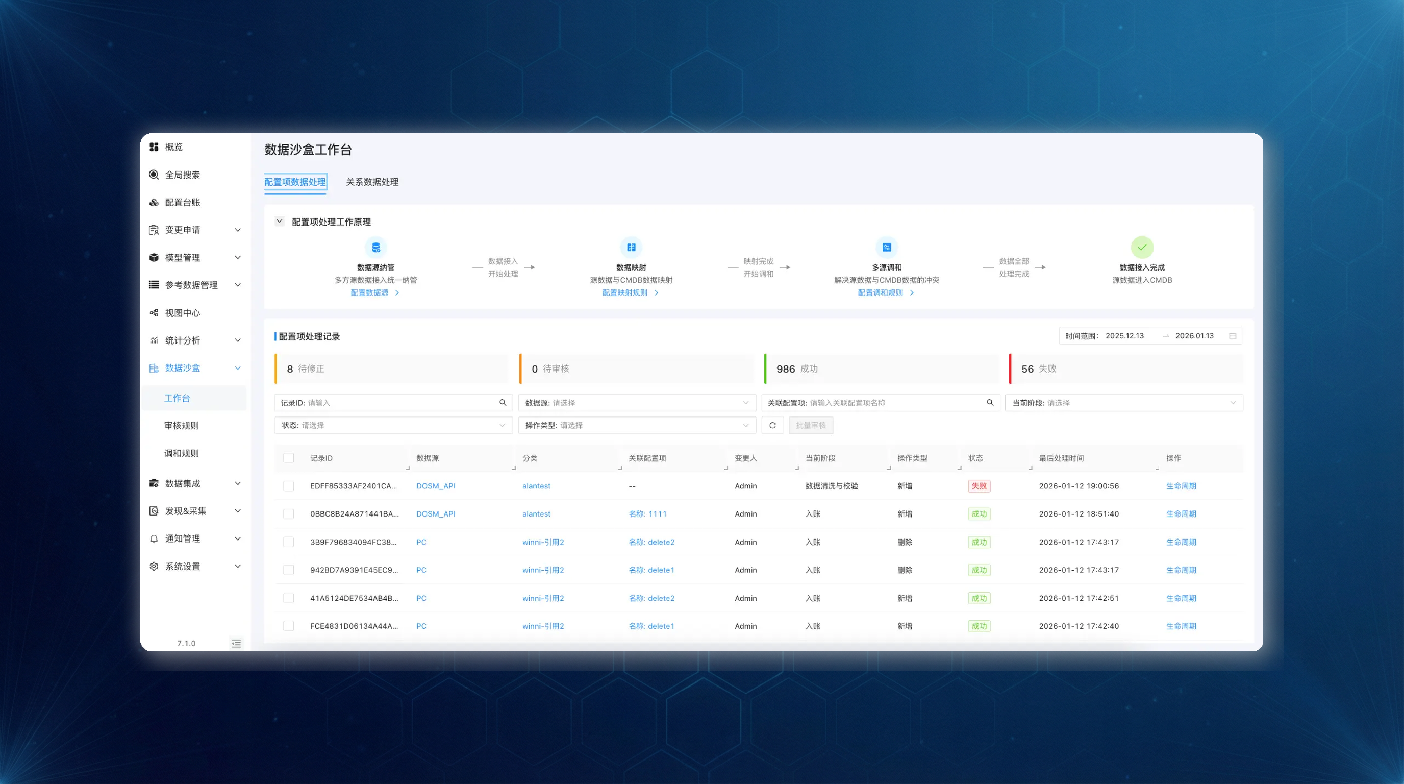 轻帆云CMDB构建了覆盖事前、事中、事后的多重数据质量保障体系。通过数据沙盒技术,实现入账前的数据清洗、多维度规则校验与多源冲突调和;结合变更审核流程与操作审计追踪,确保配置变更可管可控、操作行为全程留痕。