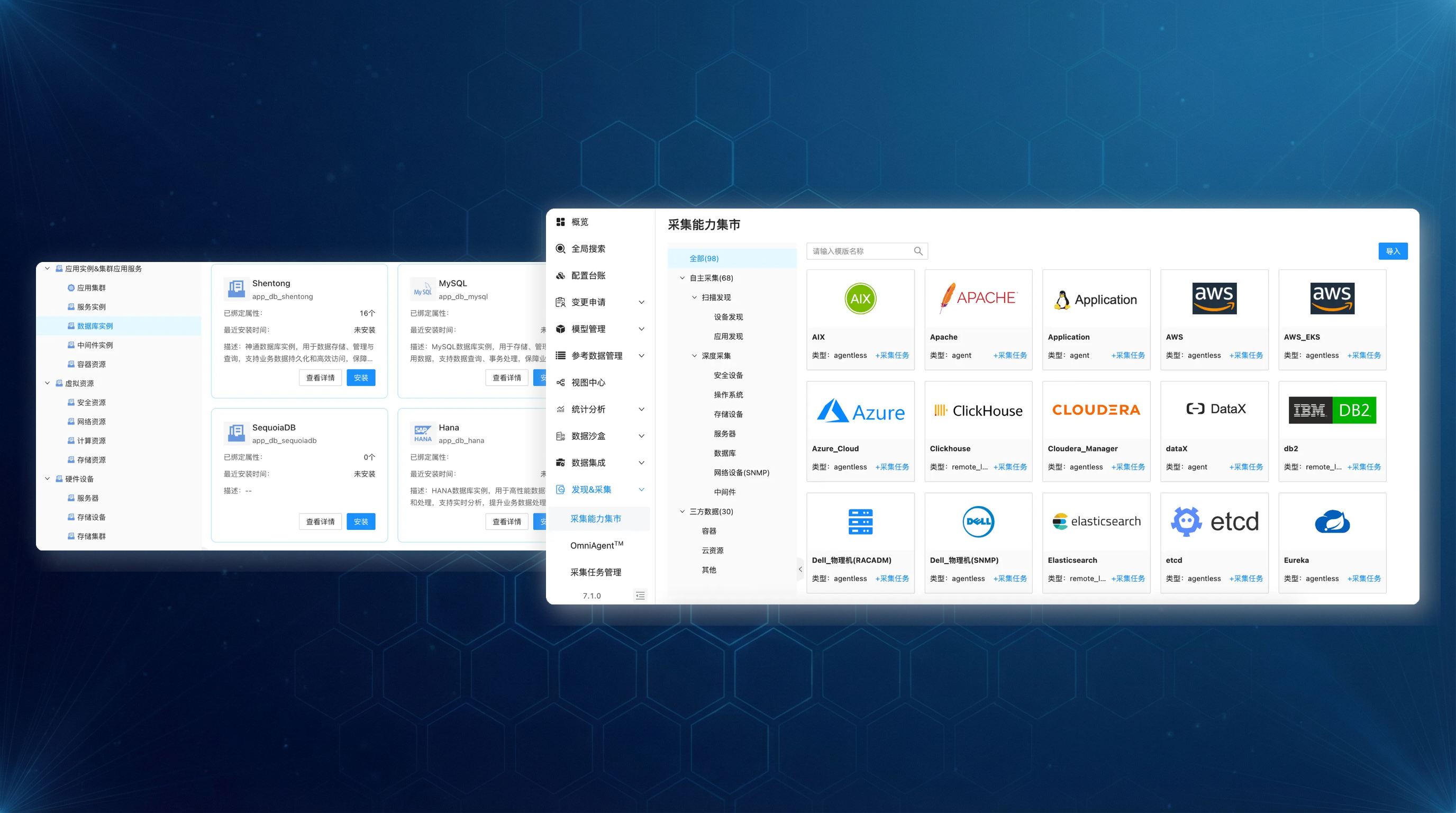 它支持开箱即用的全栈资源自动发现,覆盖网络设备、服务器、数据库、中间件及云平台等核心资产。通过远程扫描、Agentless/Agent深度发现、云资源/API对接等多种方式,实现跨物理、虚拟、公有云、私有云环境的统一采集。
