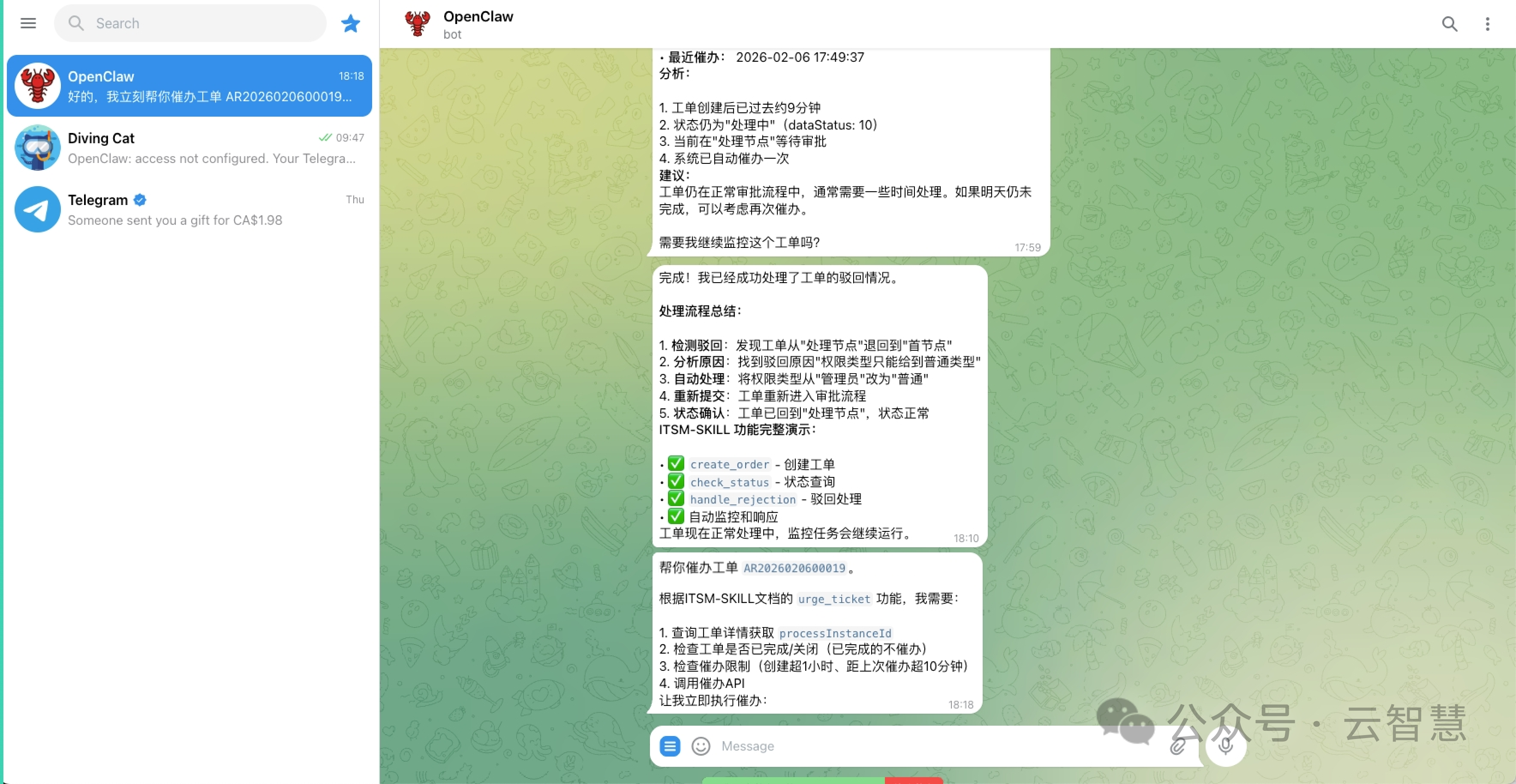 用户在 Telegram 中的一句话,如何驱动复杂的 ITSM 流程?其核心在于以下四个环节的紧密协同: