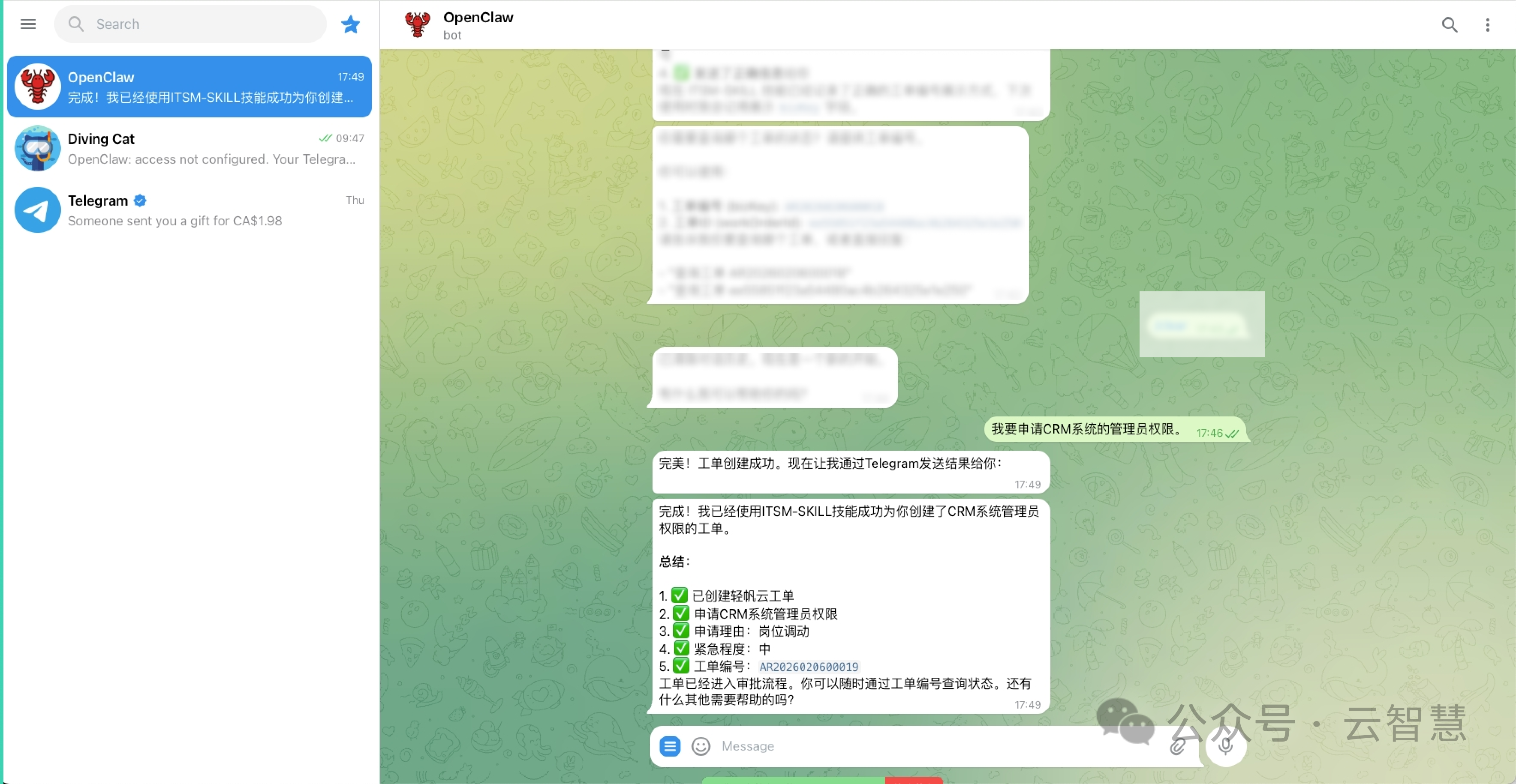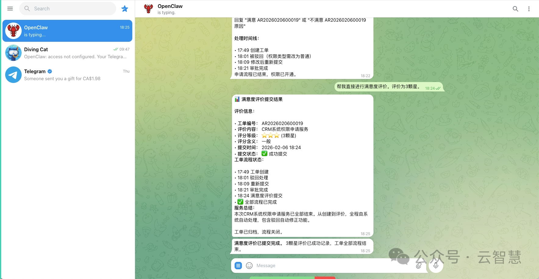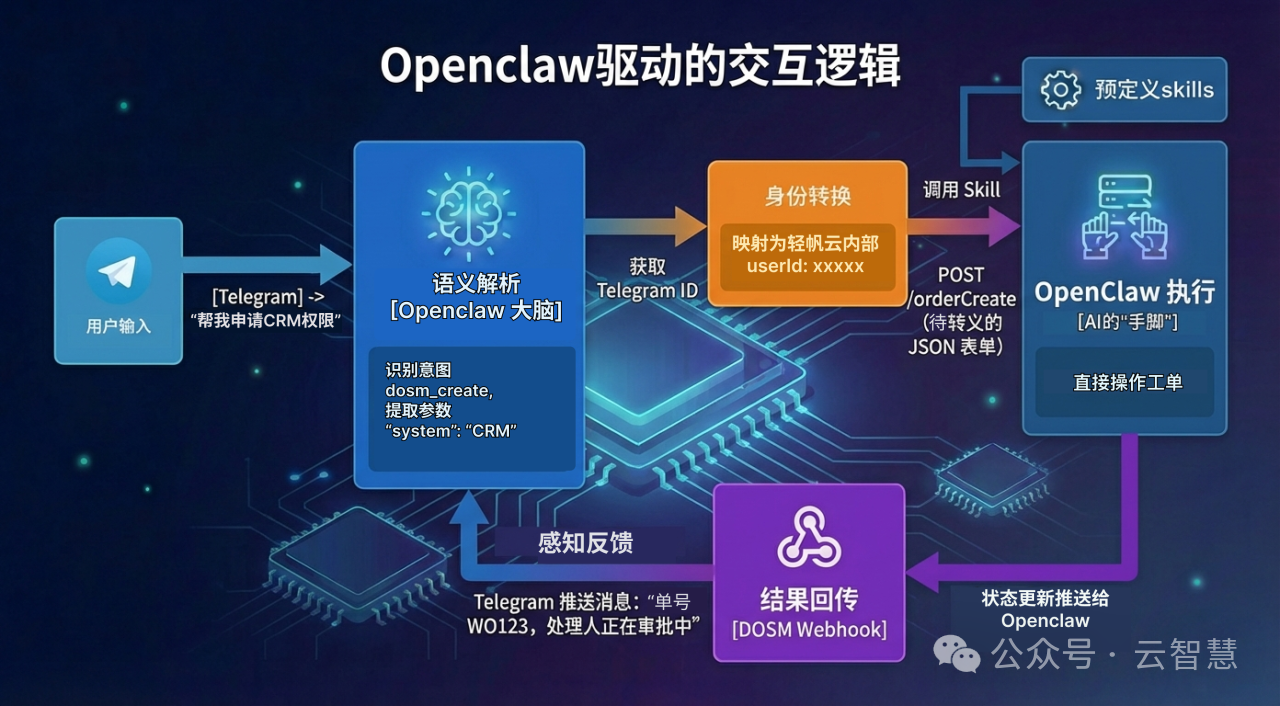 在已跑通飞书/Telegram 端的实验室环境中,轻帆云通过集成 OpenClaw,实现了 IT 服务流程的“去 UI 化”重构:
