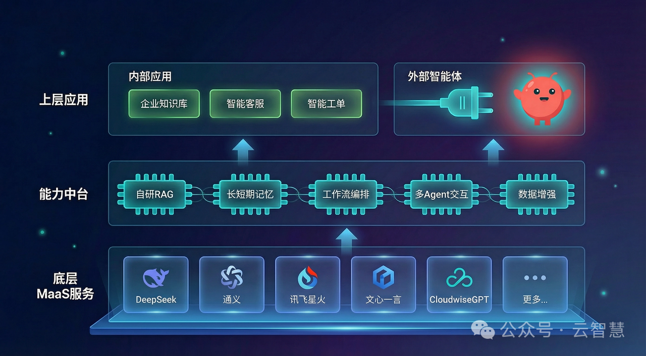 该中台底层兼容主流大模型服务(如 DeepSeek、通义、讯飞星火等),中层集成了自研的 RAG 引擎、长短时记忆机制、工作流编排系统与多 Agent 协同框架,完整覆盖从自然语言理解到跨系统执行的全链路需求。
