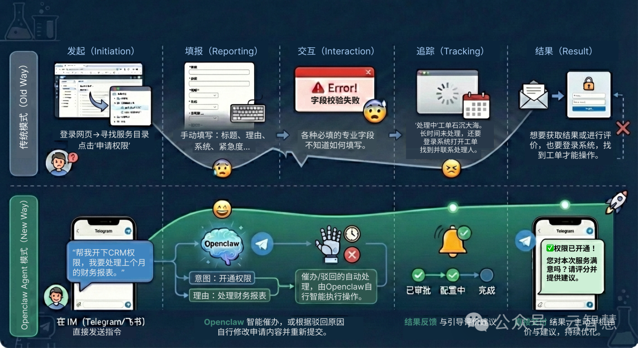 在传统 ITSM 模式中,用户需主动登录系统、浏览服务目录、填写表单、提交工单,并在后续反复登录以跟踪进度、处理驳回、催办超时、完成评价——整个过程高度依赖界面操作与人工干预,使用门槛高、体验割裂。